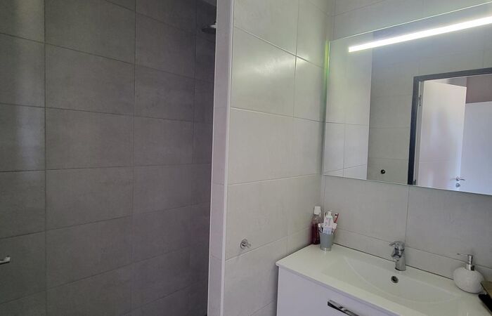 Une chambre avec sa salle d'eau fermée et équipée d'une douche à l'italienne. Un WC séparé équipé d'un lave main et une buanderie donnant sur le garage attenant.