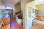 Quelques marches pour atteindre le perron et l’entrée s’effectue dans un vestibule qui distribue de part et d’autre, cuisine, salon-salle à manger avec cheminée, puis buanderie.