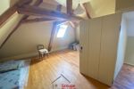 L’étage supérieur est occupé par 3 chambres se partageant une vaste salle de bains-wc. Au-dessus, une chambre aménagée dans les anciens combles avec une partie grenier restante.