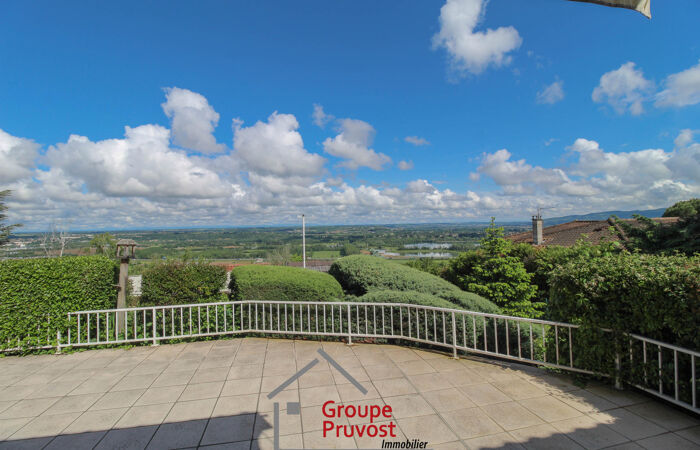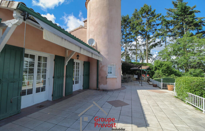Limas - Emplacement exceptionnel sur les hauteurs avec vue sur la Saône. L'agence Pruvost vous propose cette magnifique propriété d'architecte d'une surface d'environ 280m² comprenant sur la partie principale de plain pied une vaste entrée desservant un double séjour, un espace salle à manger et cuisine équipée ouverte, le tout donnant sur la terrasse, grande chambre, salle de bains, WC séparés et à l'étage une chambre parentale avec dressing (peut devenir une chambre) et salle d'eau. Dans la continuité du plain-pied, un appartement pouvant être indépendant avec salon, salle à manger, cuisine, 2 chambres, salle d'eau et WC. Le sous-sol offre de nombreux espaces, buanderie, chaufferie, espace de stockage, et une grande cave aménagée avec bar. Vous profiterez d'un magnifique terrain entièrement clos et paysagé, une spacieuse terrasse avec coin repas et salon ainsi que d'un espace avec piscine 11x6. Un carport vous permettra d'abriter 2 véhicules. Propriété coup de cœur: emplacement résidentiel aux portes de Villefranche, Vue, matériaux de qualité, volumes et espaces, état impeccable, possibilité 2 logements. Agence immobilière PRUVOST : Virginie FOURNIER - 06.06.49.74.46 / Agent Commercial, RCP n° VD 7.000.002 / N° ACI01288
