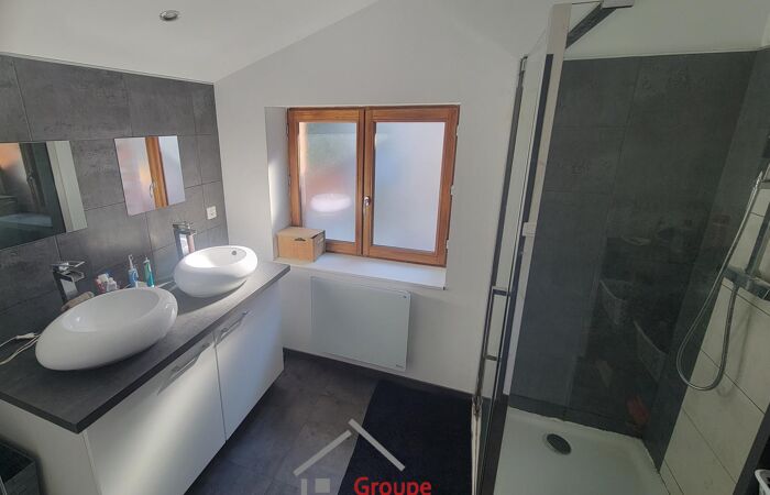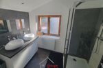 Une salle d'eau équipée d'une douche, d'un meuble double vasque. Un WC séparé et un débarras à rénover entièrement pouvant servir faire office de bureau.