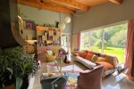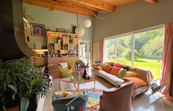 L’entrée distribue une cuisine contemporaine, lumineuse et parfaitement équipée, prolongée par une véranda et un grand cellier. Les pièces de réception offrent de superbes volumes : le séjour communique avec un salon chaleureux, puis un second salon avec cheminée et larges baies vitrées ouvertes sur le jardin. Une grande chambre avec salle de bains complète ce niveau.