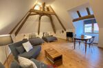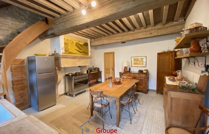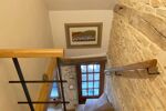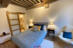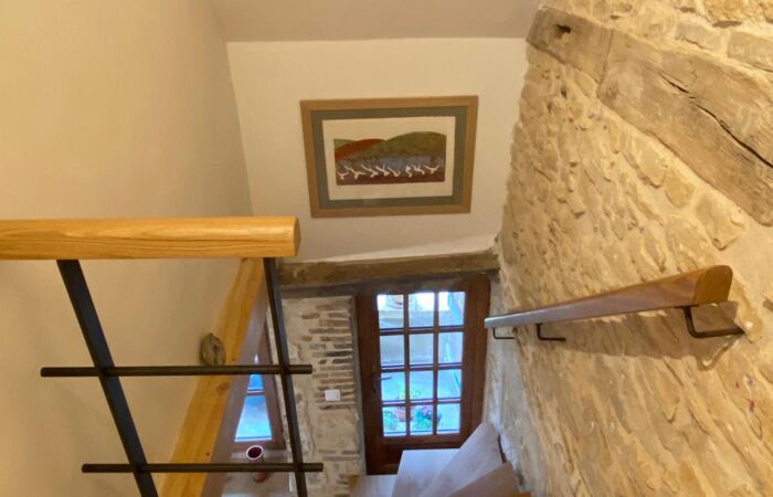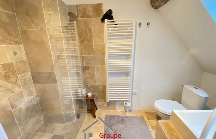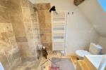 Accessible depuis le séjour-cuisine, un bel escalier mène à l’étage offrant une vaste chambre sous toiture avec sa salle de bains-wc.