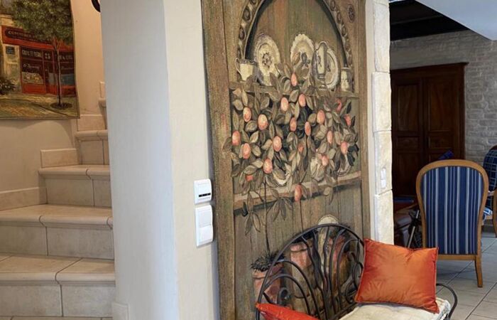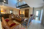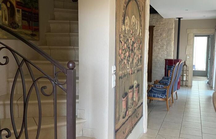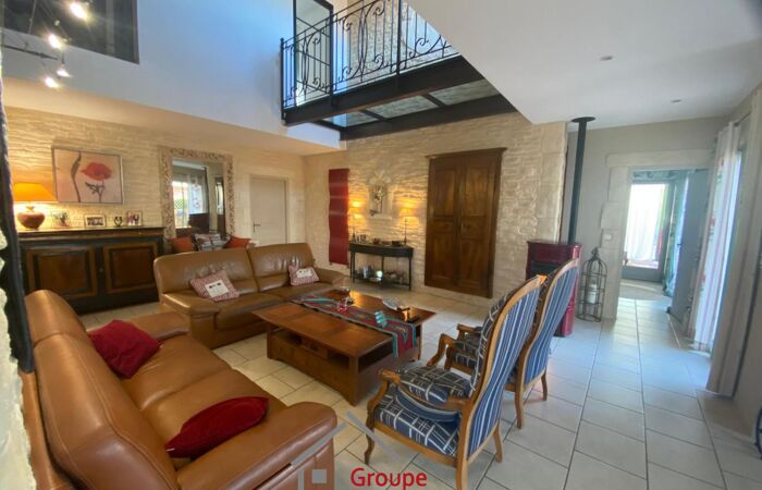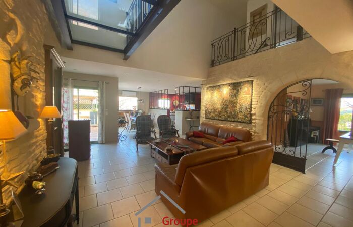Dés l'entrée, vous découvrirez un salon cathédrale sublimé par une passerelle en verre et une cheminée offrant une atmosphère chaleureuse et contemporaine .