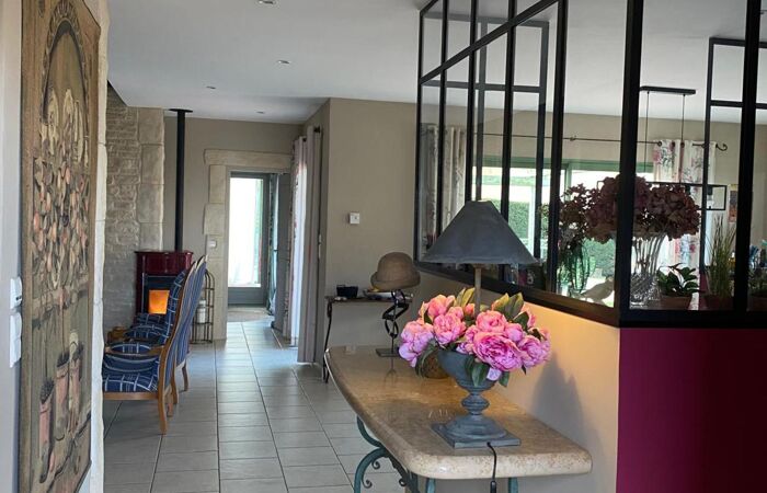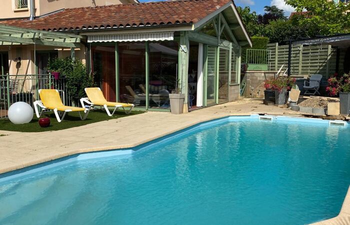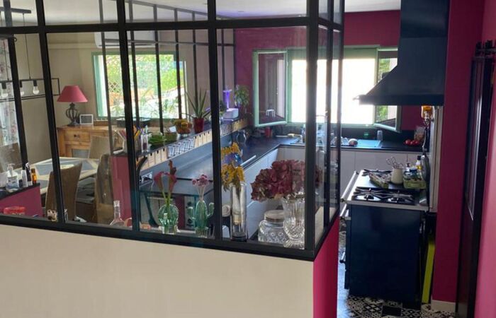 La maison s'articule autour d'une superbe extension vitrée offrant une vue directe sur la piscine pouvant accueillir un espace de réception ou un jardin d'hiver parfaite continuité avec l'extérieur .