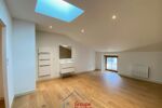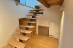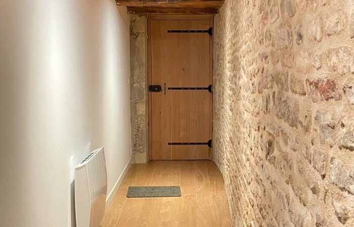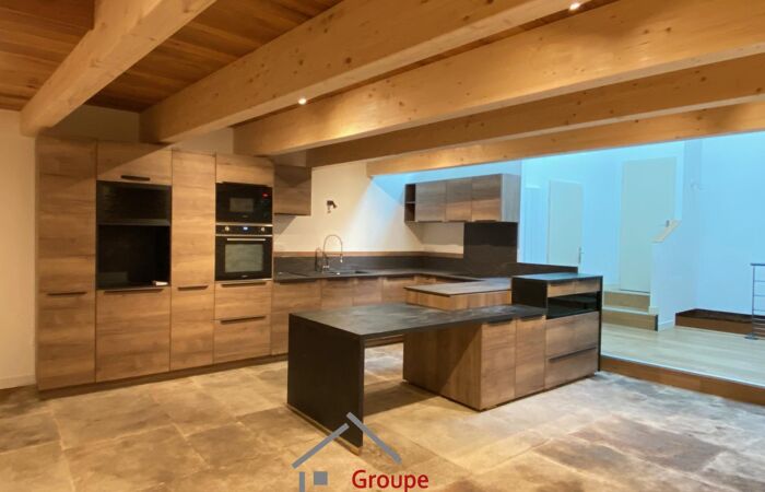 Le rez-de-chaussée présente un garage avec une entrée s’ouvrant sur une très belle pièce voûtée. Au-dessus, cuisine-séjour, wc et à un demi-niveau supérieur : une chambre avec dressing et salle d’eau. Le dernier niveau bénéficie de 2 chambres avec dressing, se partageant une salle d’eau-wc.