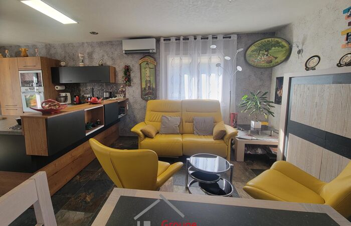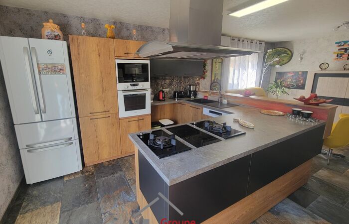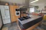 Une cuisine équipée Schmit ouverte sur le un salon / séjour d'environ 50 m2 avec accès sur la terrasse, trois chambres respectivement de de 9 m2, 9 m2 et 10,5 m2.