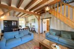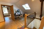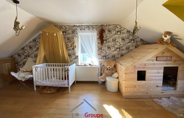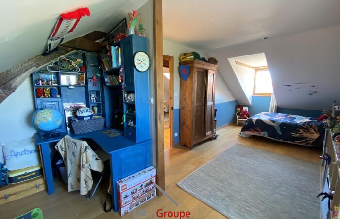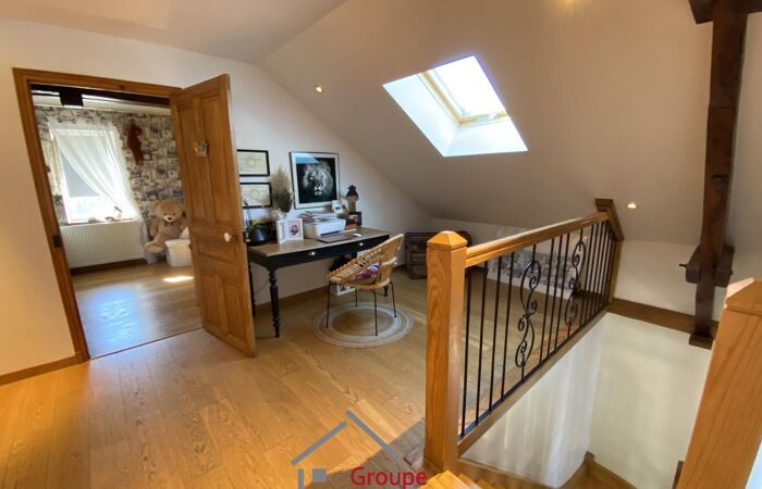 Du séjour, un escalier mène à l’étage où un palier aménagé avec un espace bureau distribue deux chambres supplémentaires ainsi qu’une salle d’eau-wc.